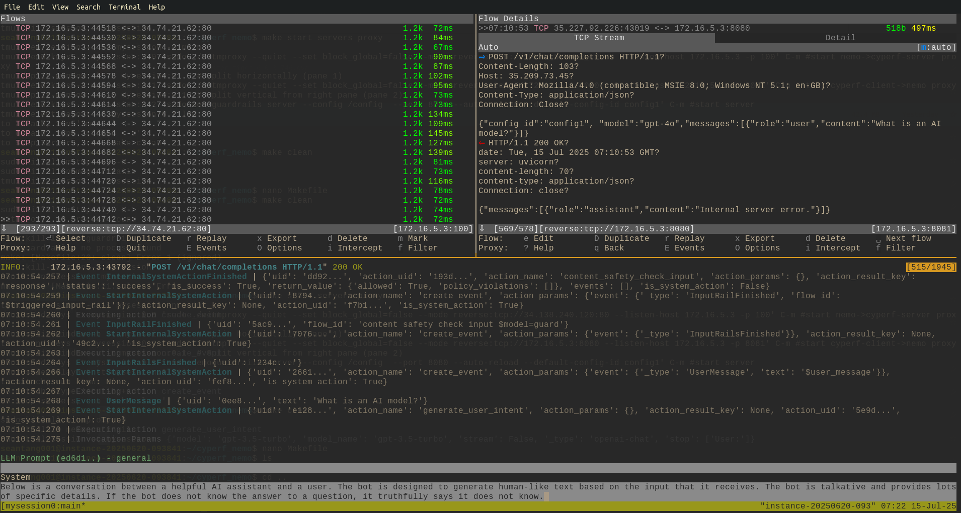 If your test runs correctly, you should be able to see proxy going through your tmux shell on the nemo guardrail server.